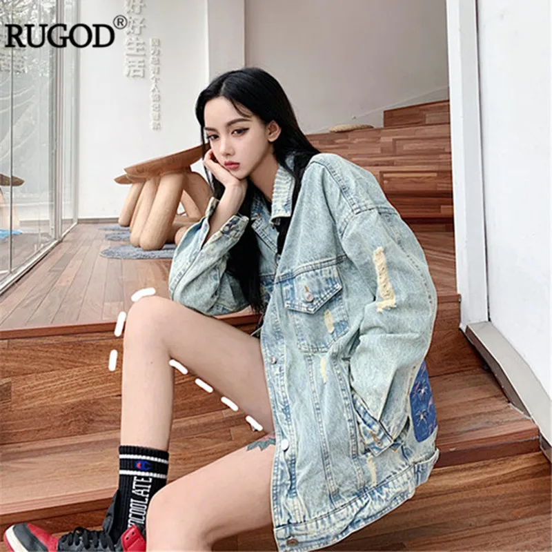 RUGOD 2019 Autumn Winter Fashion Print Loose Jean Jacket Women Casual Vintage Turn-down Collar Long Sleeve Denim Jacket casaco :Click Here