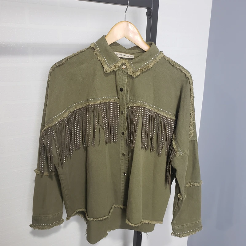 Low Price 2019 herbst Quasten Denim Jacke Lose Armee Grüne Taste Mantel Frau Jeans Jacke Unregelmäßigen Saum
