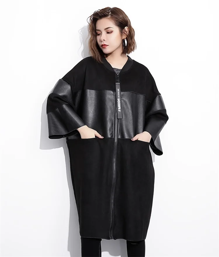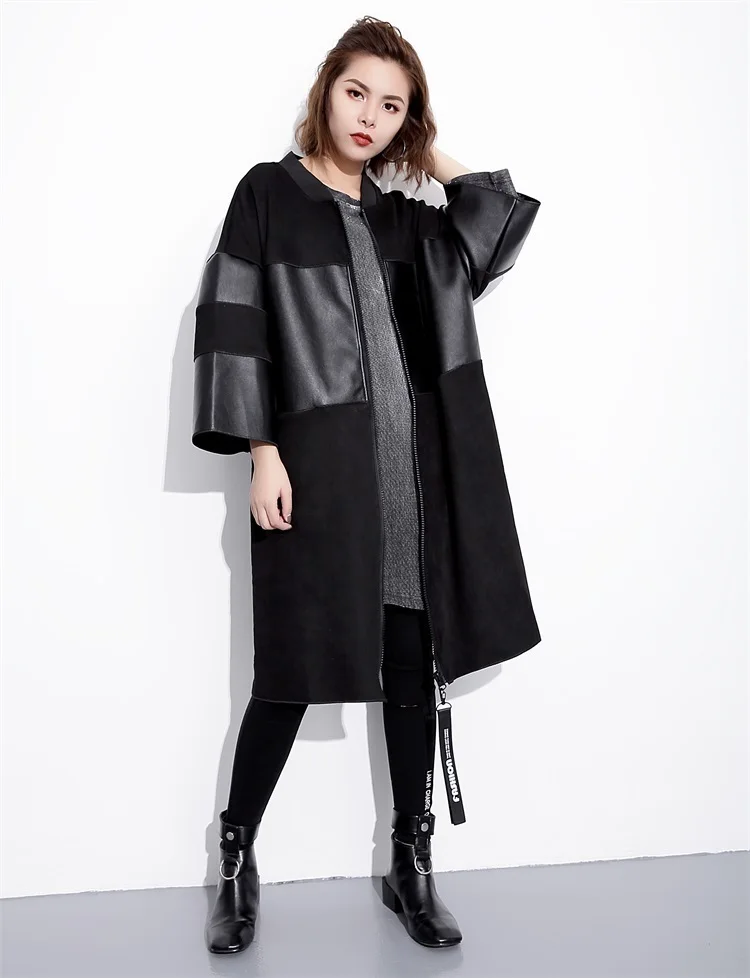 Goods [EAM] Lose Fit Schwarz Pu Leder Gespleißt Big Größe Jacke Neue Stehkragen Langarm Frauen Mantel Mod