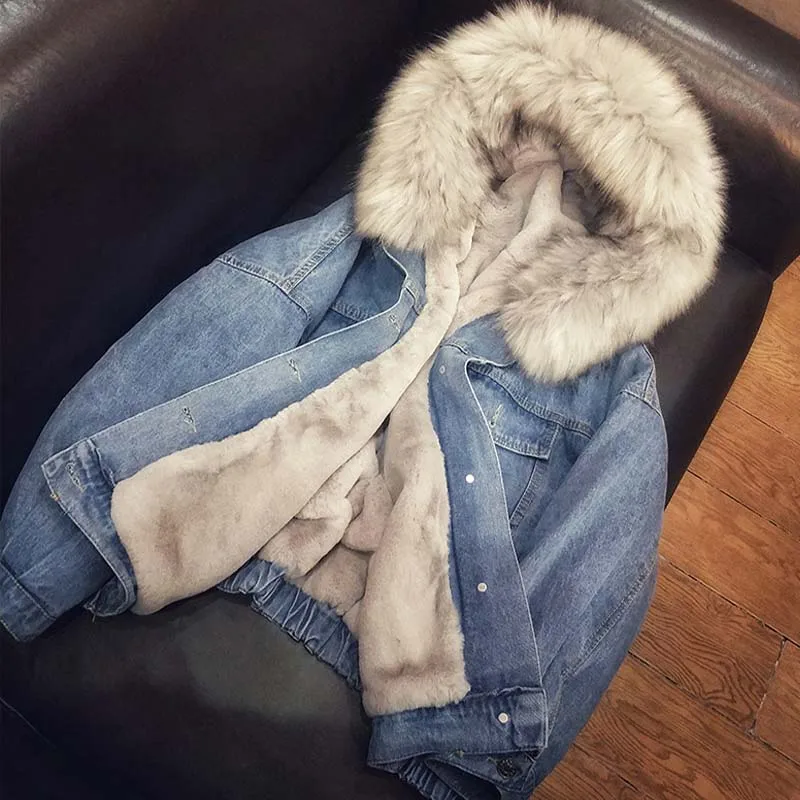 Buy Online Frauen Denim Jacke Mit Pelz Winter Jeans Mit Kapuze Samt Mantel Weibliche Faux Pelz Kragen 2019 Pad