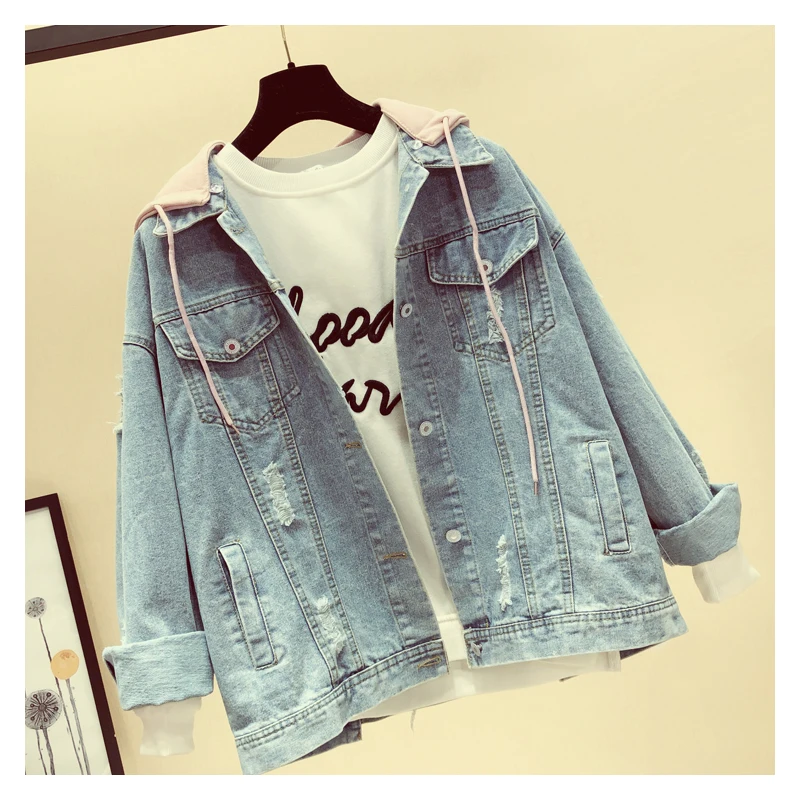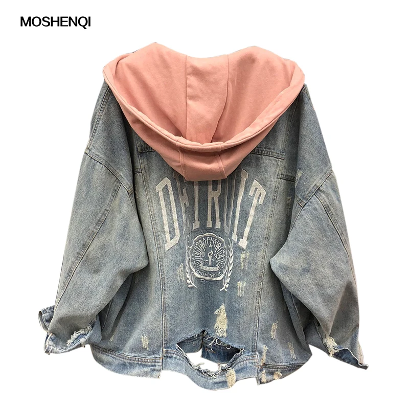 New MOSHENQI Denim Jacke Frauen Herbst Mantel Zerrissene Mit Kapuze Oberbekleidung Mäntel Windjacke Gru