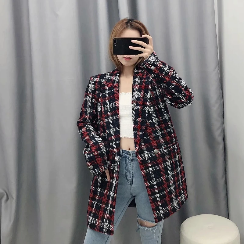 2019 women vintage houndstooth plaid print double breasted casual coat female woolen outwear jacket chic leisure mujer CT333 :Click Here
