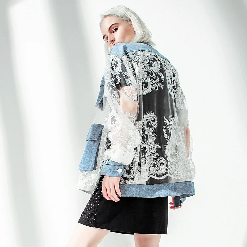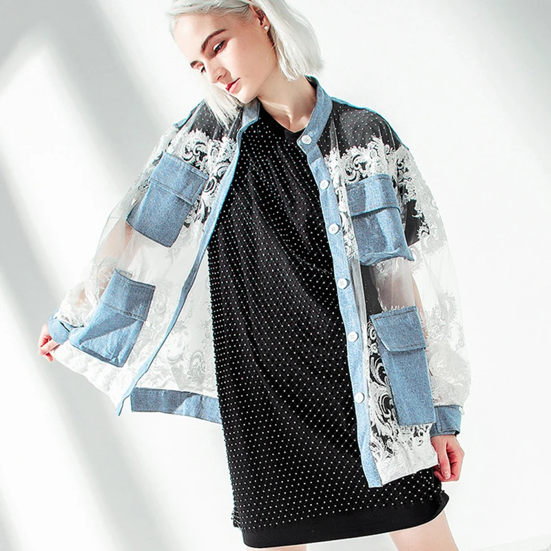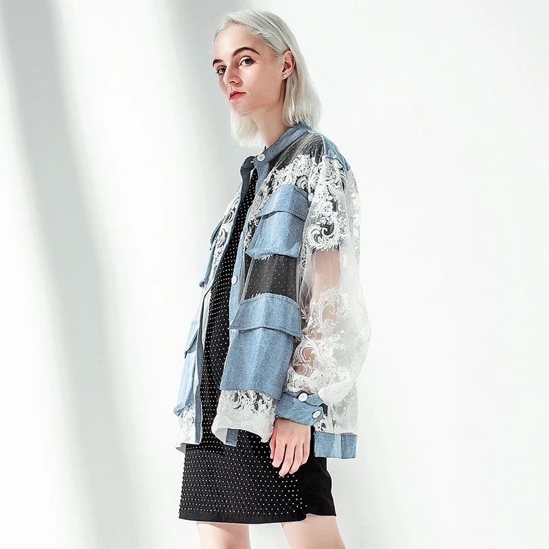 Buy Online [EAM] 2020 Neue Herbst Winter Stehkragen Langarm Blau Denim Spitze Split Joint Große Größe Jacke Fr