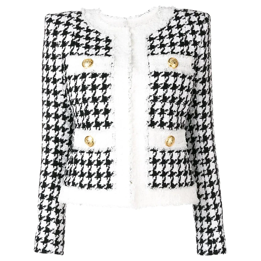 New Fashion Runway 2020 Designer Jacket Women's Long Sleeve Badge Embroidery Rivet Houndstooth Tweed Jacket Outer Coat :Click Here