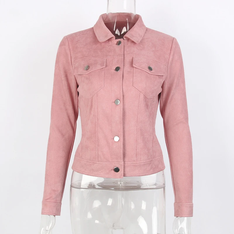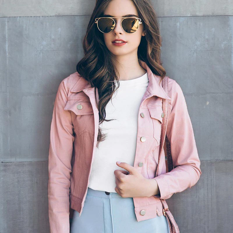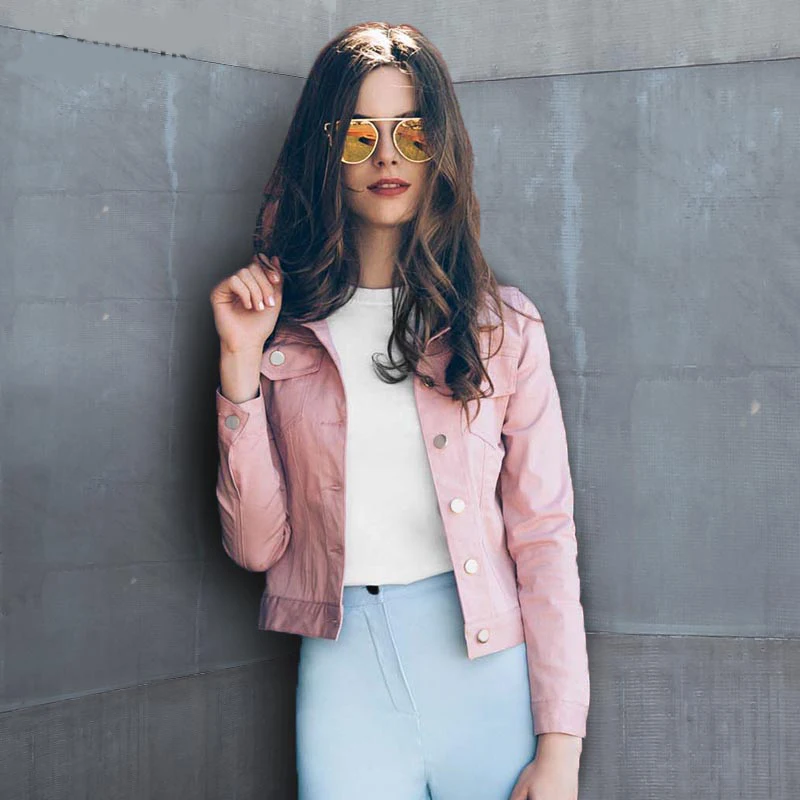 Popular Product Rosa Herbst Frauen Crop jacke Lange Hülse Drehen-unten Dünne Kurze jacke Leder mantel Vintage einre
