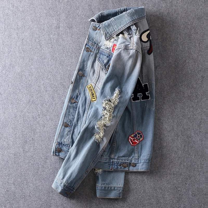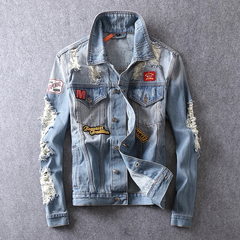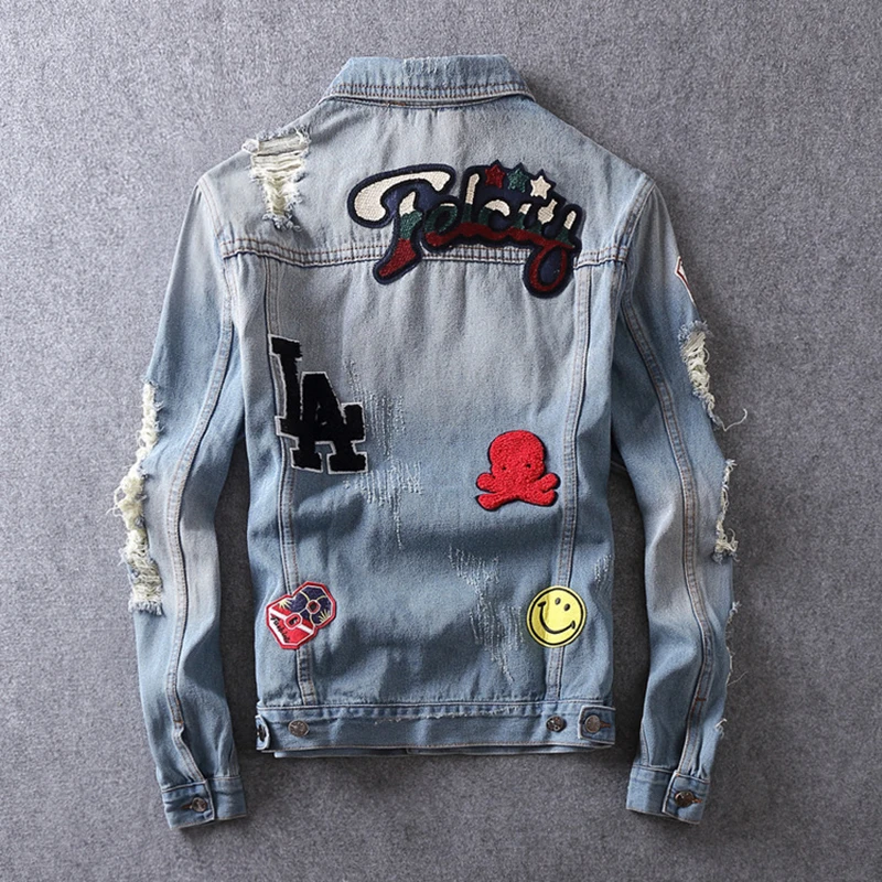 ABOORUN Men's Brand Denim Jackets Punk Rings Badges Painted Denim Jackets Hip Hop Jeans Coat for Male R871 :Click Here