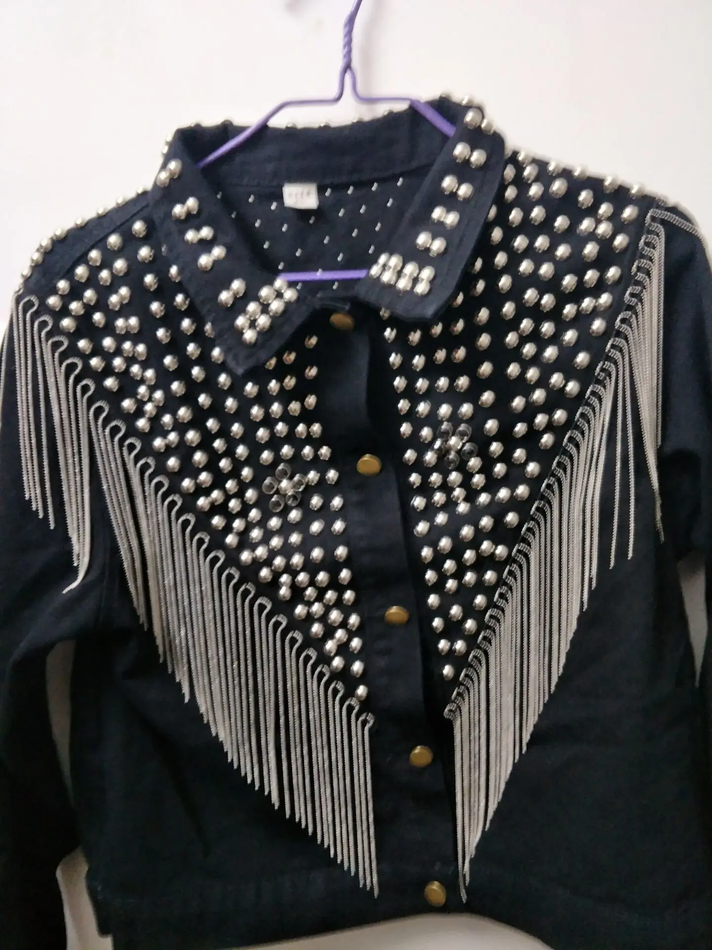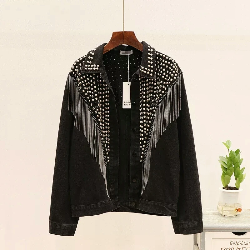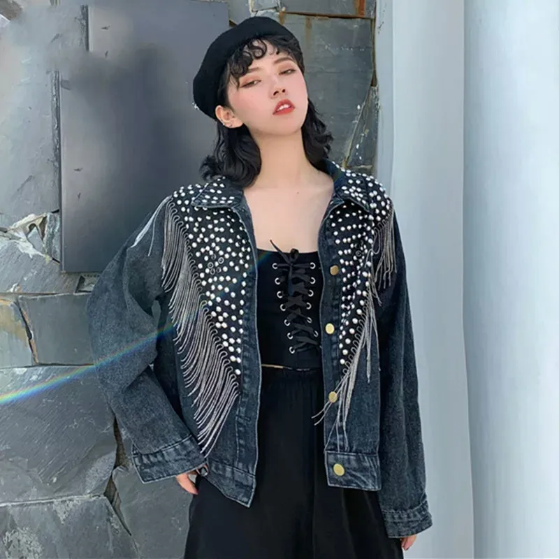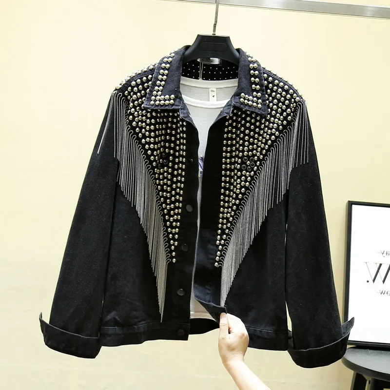 2019 Autumn Denim Jacket for Women Rivet Tassel Chain Short Coats Woman Loose Streetwear Long Sleeve Black Coats Outerwear :Click Here