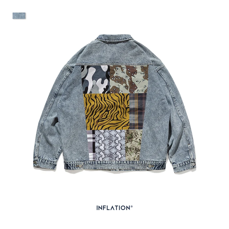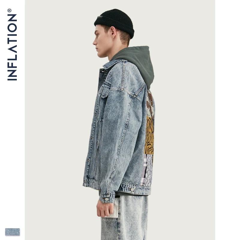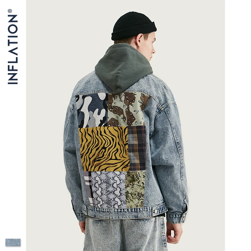 Trend INFLATION männer Hip Hop Stickerei Jeans Jacke Männer Bck Patchwork Tuch Jean Jacke Oberbekleidung