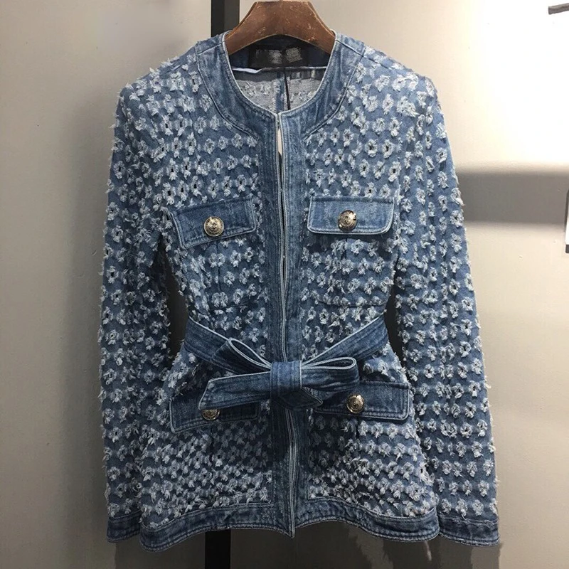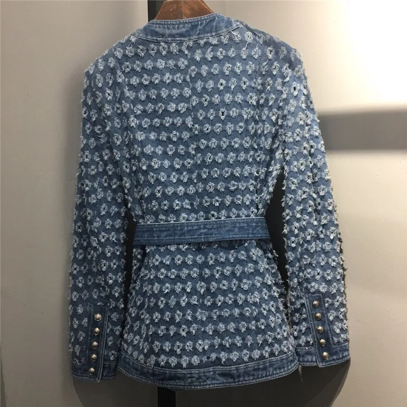 Trend [LIVIVIO] Vintage Blue Denim Jacke Mit Gürtel Taille Ripped Loch Frauen Mantel 2019 Herbst Langarm