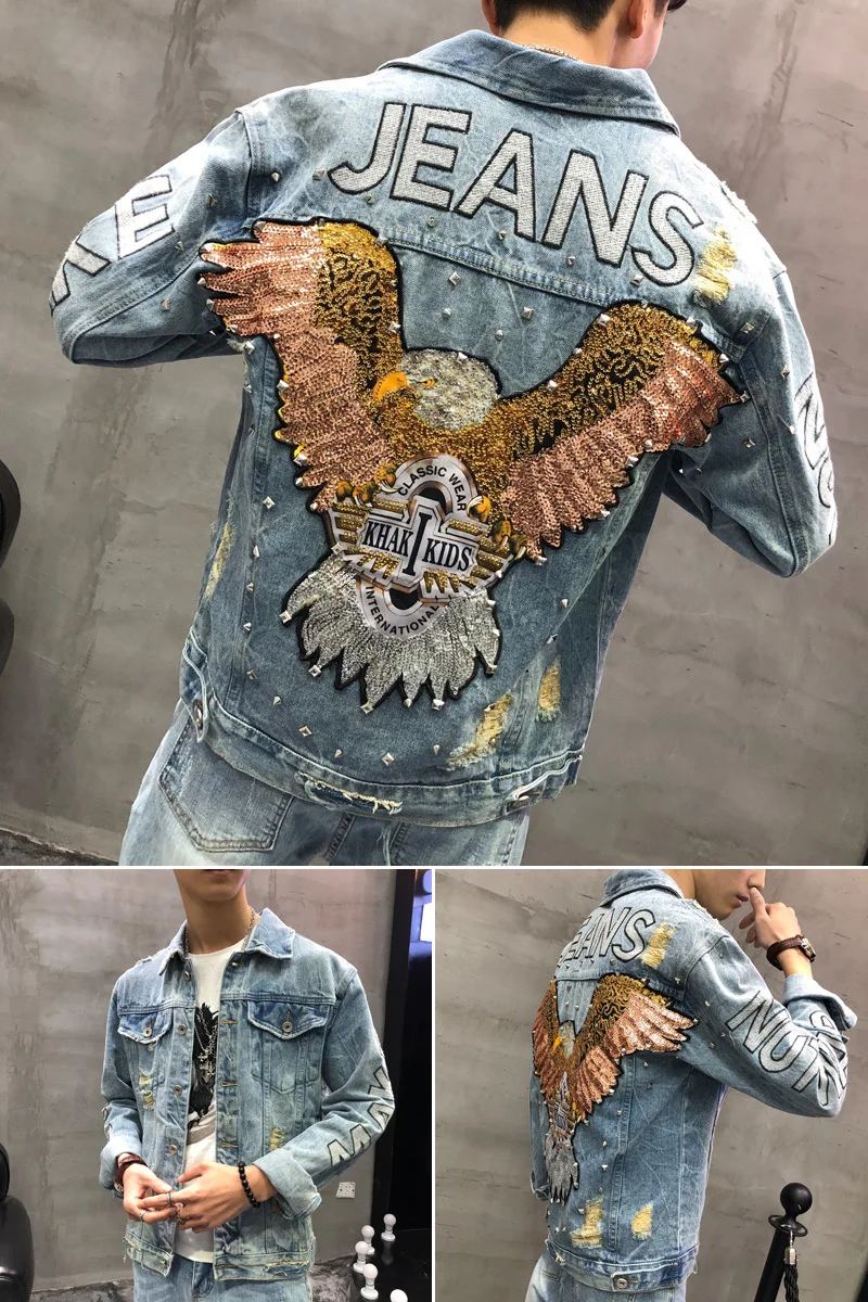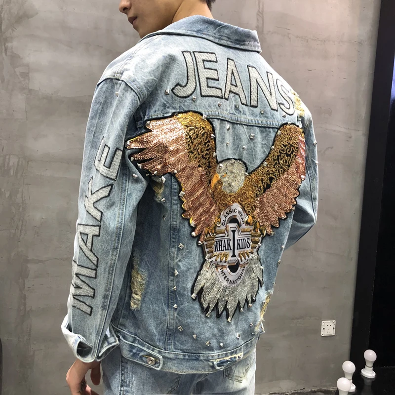 Casual Hip Hop Fashion Men Denim Jacket Chamarra De Mezclilla Dama Eagle Printed Broken Hole Beads Eagle Jeans Gold Stage Jacket :Click Here