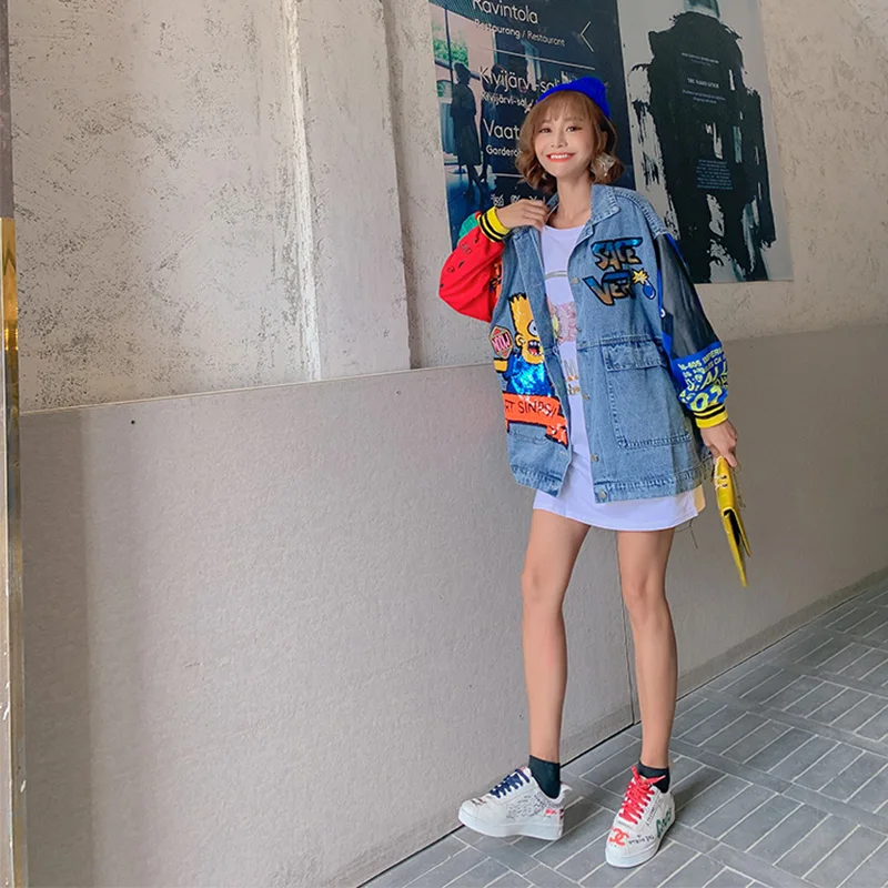 2019 Autumn denim jackets hole cartoon graffiti women chic jackets :Click Here