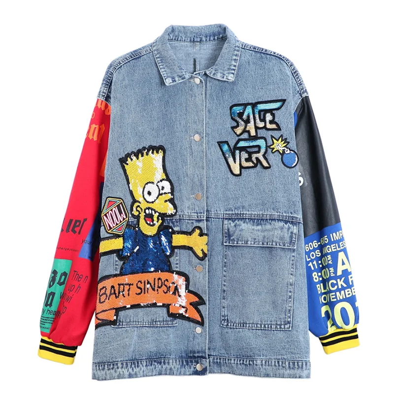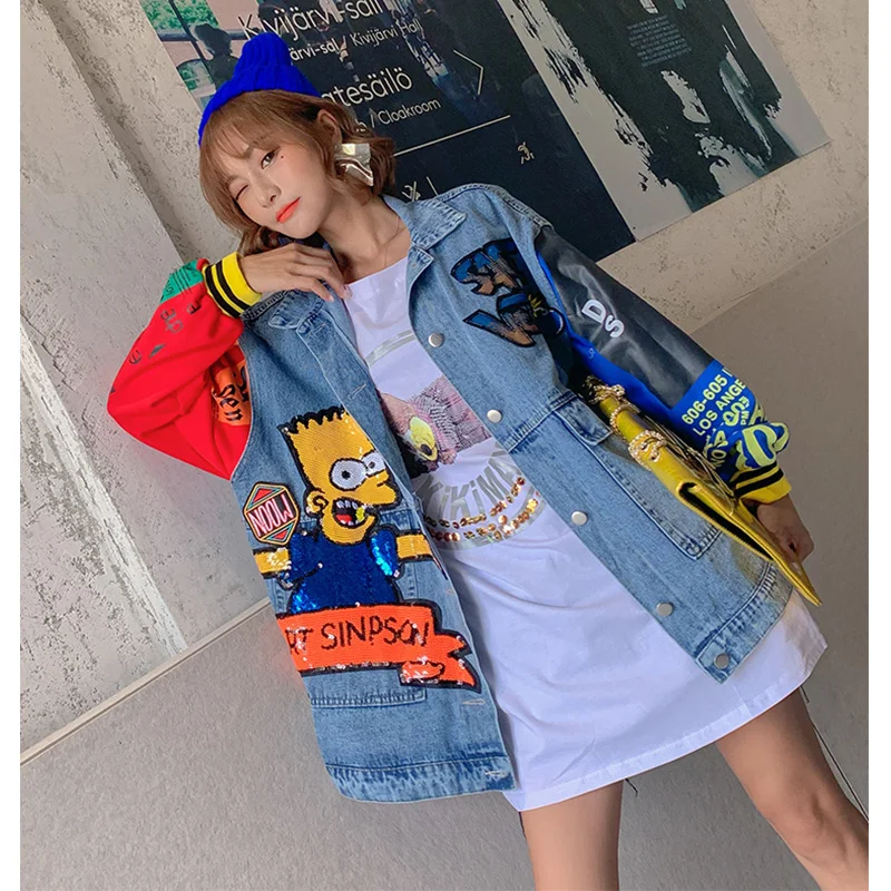 Trend 2019 herbst cartoon pailletten designs denim jacken mode frauen lange jacken