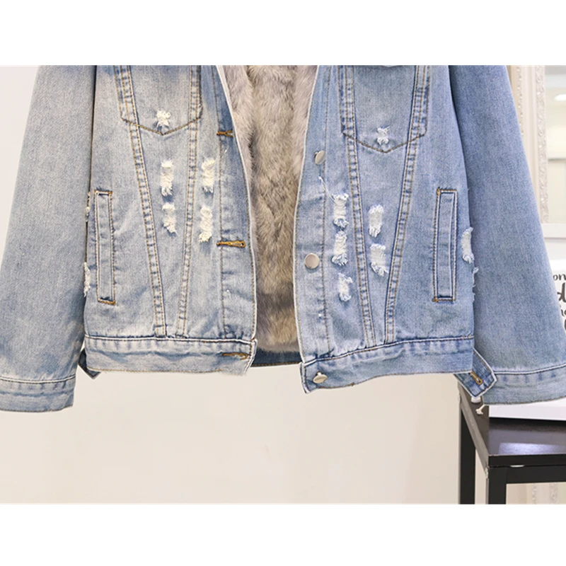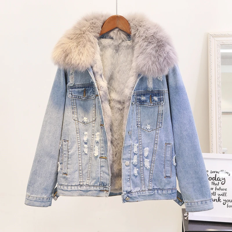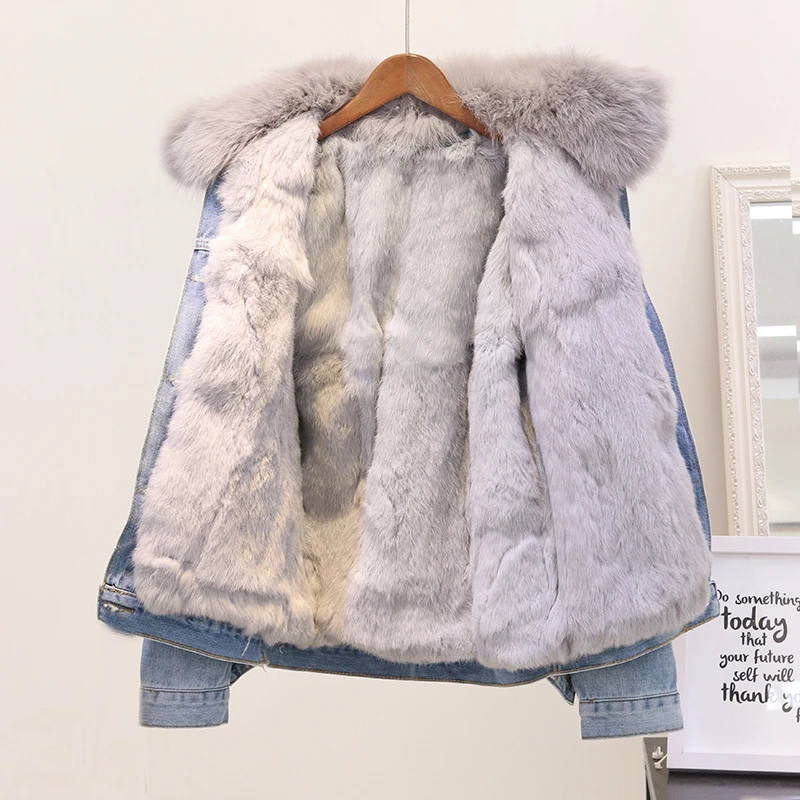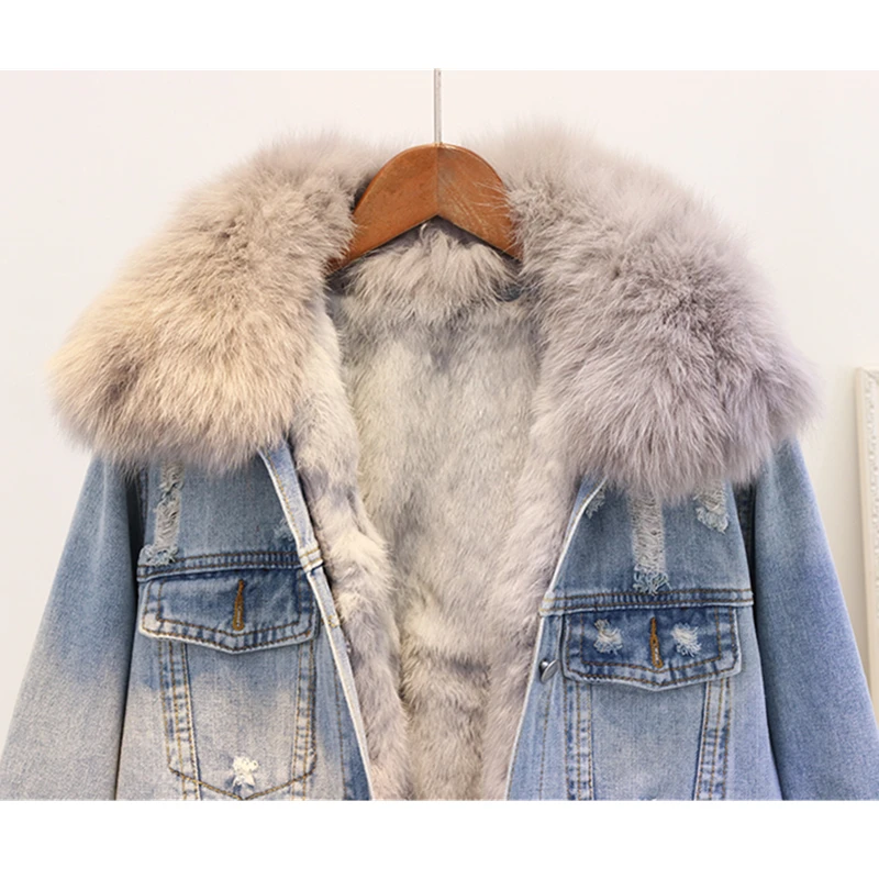 Big Sale Vintage Winter Warme Denim mantel Frauen Fuchs Pelz Kragen Echt Kaninchen Haar Gefüttert Jeans Jack