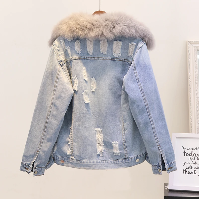 2019 Winter New Women Jacket Jeans Fox Fur Collar Korean Detachable Lamb Plush Liner Loose Beading Denim Jacket Ladies Overcoat :Click Here