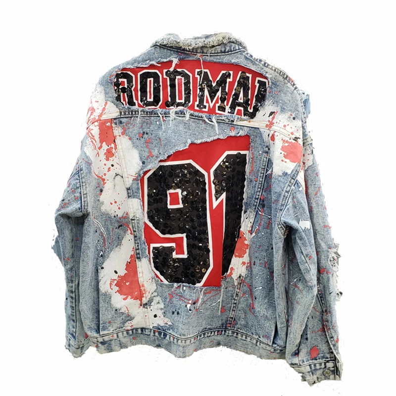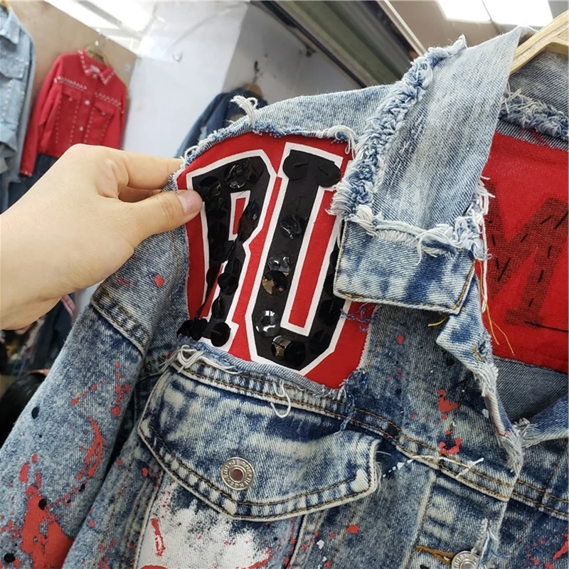 Trend Product Frühling Graffiti gedruckt pailletten Denim Mantel Langarm Perle Lose Harajuku BF Jeans Jacke Löche