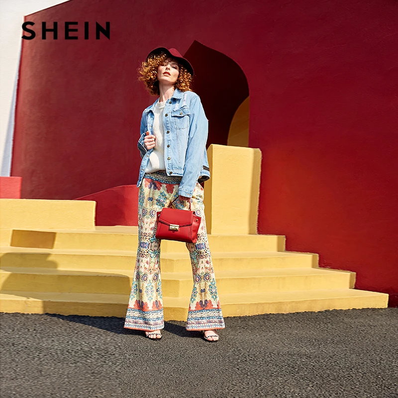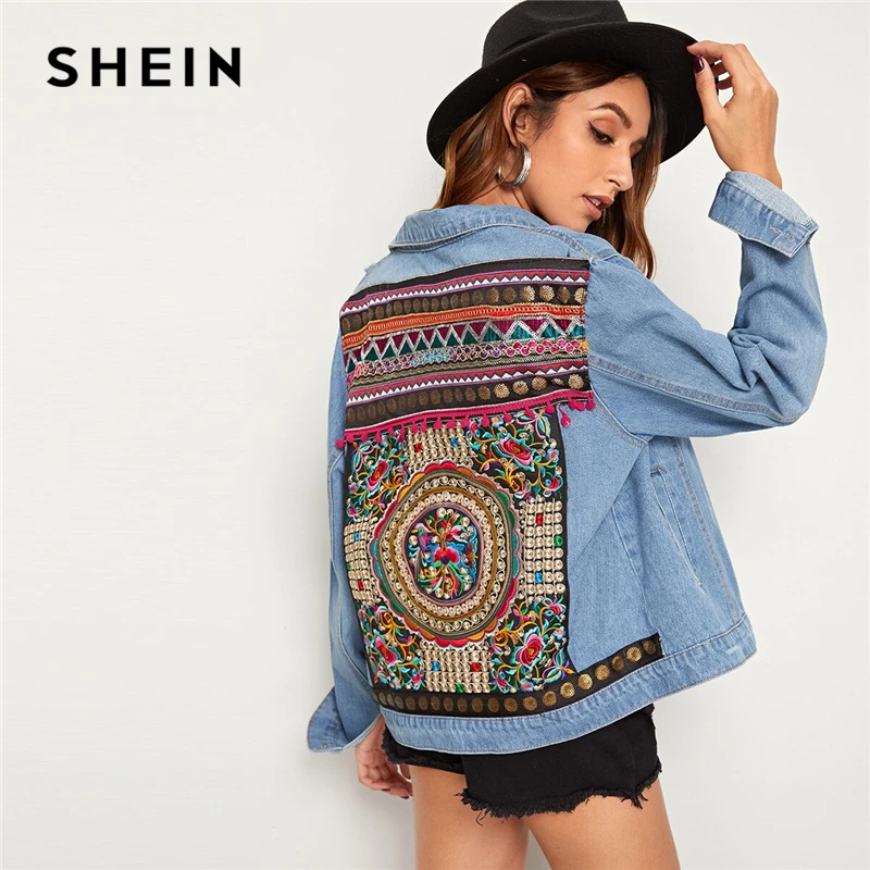 Best SHEIN Blau Gestickte Zurück Tasche Denim Frühjahr Jacke Mantel Frauen Herbst 2019 Street Einreiher