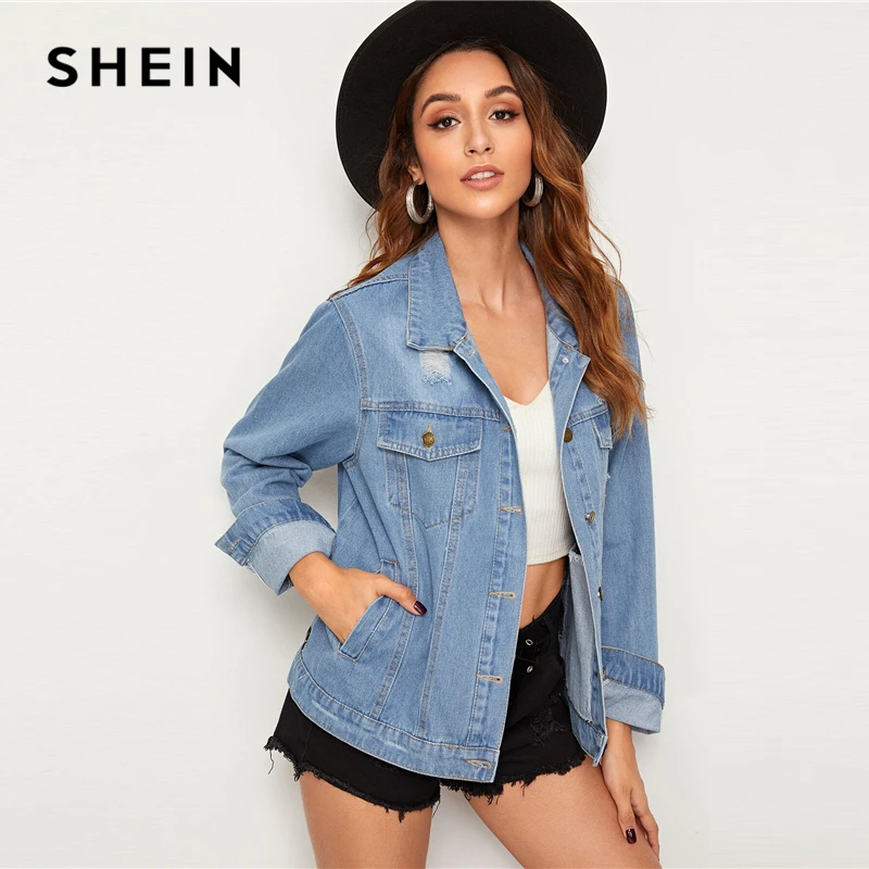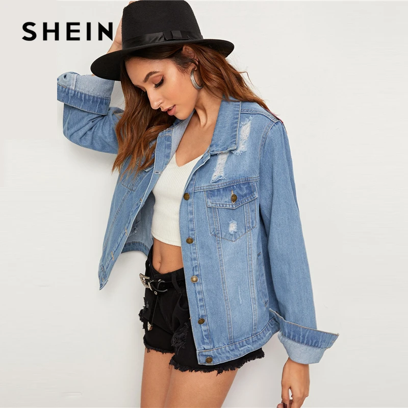 SHEIN Ripped Faded Wash Stitch Detail Jeans Jacket Women Casual Single Breasted Denim Jacket Blue Loose Ladies Korean Jacket :Click Here